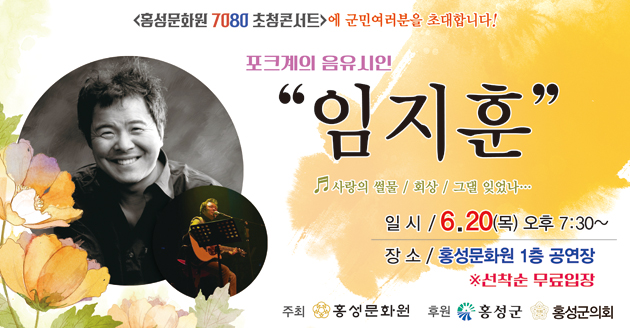 홍성문화원(원장 유환동)은 오는 20일 저녁 7시 30분 홍성문화원 공연장에서 통기타로 유명한 가수 임지훈을 초청해 지역문화예술을 사랑하는 홍성 지역민들과 하나 되는 문화공연인 ‘7080 초청 콘서트’를 개최한다.