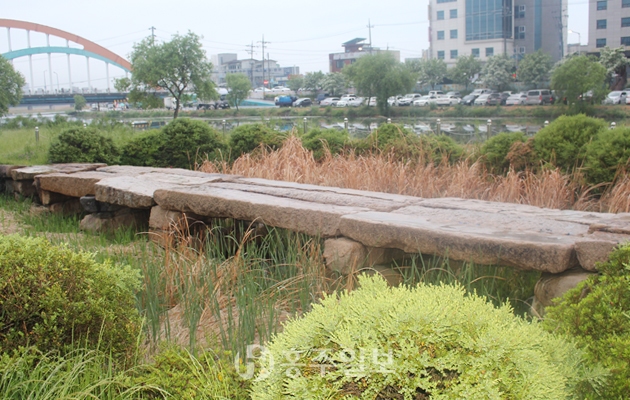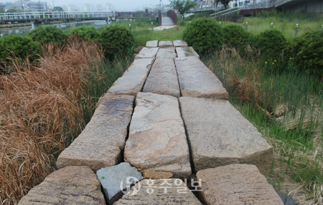 한내돌다리 “옛날 남포 비인방면에서 보령현을 거쳐 한양으로 통하는 교통요지인 대천천 하류(현 대천철교 위 방향 50m)에 놓였던 돌다리로 일제시대 초기까지 주 교통로로 이용됐다. 다리의 규모는 폭 2.38m, 길이 50여m로 12경간으로 돼 있었다고 전해진다. 다리의 구조는 1.5~2.0m정도의 자연석 지대석을 묻고 그 위에 다듬은 받침돌 3단을 횡으로 쌓아 다리 기둥과 멍에를 대신 한 다음 그 위에 길이 3.0~4.5m, 폭 70~90cm, 두께 30~40cm 정도의 다듬은 시렁돌 3개를 얹어 다리 바닥을 구성했다. 바닥이 3개의 시렁돌로 이뤄져 우마차 통행에 적당하게 설계 된 단순하고 실용적인 다리이다. 석재는 거의 화강석으로 돼 있는데 석질로 보아 왕대산에서 채취해 큰 사리 때 뗏목으로 운반해 왔을 것으로 추정된다. 설치시기는 동국여지지, 여지도서, 신안읍지 등에 언급돼 있는 것으로 봐 17세기 이전으로 보인다. 양식은 고려 원종 15년(1274)에 만들어진 함평 고막천 석교와 비슷하다. 1970년대 초까지 약 20m정도가 남아 있다가 붕괴돼 일부는 하천제방 석축으로 사용되고 일부는 1976년 7월 읍사무소로 옮겨 보존하다가 1992년 12월 이곳에 복원했다”고 한다.