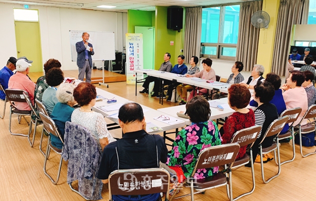 홍성군노인종합복지관(관장 동준스님)은 홍성지역 은퇴 세대 어르신들을 대상으로 자기계발과 사회참여활동을 돕기 위해 자질을 높이고자 실시된 뉴시니어 인생교실 사업의 일환으로 지난 17일 (주)홍주일보사 한관우 대표이사를 초청해 기자단 교육을 실시했다.<사진>