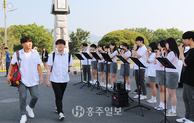 홍주고등학교(교장 이상헌)의 자율동아리 ‘Beyond us(비욘드 어스·회장 정시윤)’는 지난 12일 학생들이 등교하는 아침시간에 학년 초부터 갈고닦은 오카리나 실력을 뽐내며 연주회를 열었다.<사진>
