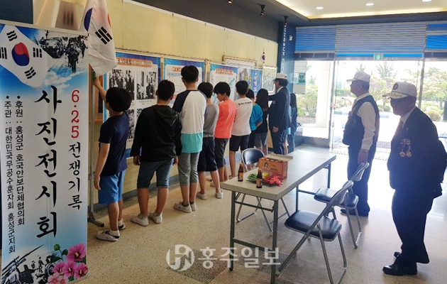 대한민국무공수훈자회 홍성군지회(회장 최종수)는 지난 24일 홍북초등학교 내에 남북분단과 비극의 참상을 재인식하고 6·25전쟁을 경험하지 못한 학생들에게 공감대를 형성하기 위한 ‘6·25전쟁 기록 사진 전시회’를 개최했다.