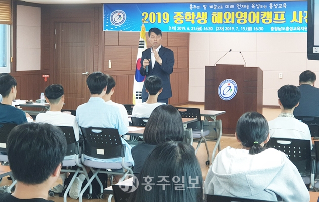 충청남도홍성교육지원청(교육장 주도연)은 지난달 21일 홍성교육지원청 대회의실에서 2019홍성교육지원청 중학생 해외영어캠프에 참가하는 학생 25명과 학부모를 대상으로 사전교육을 실시헀다.<사진>