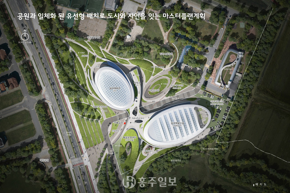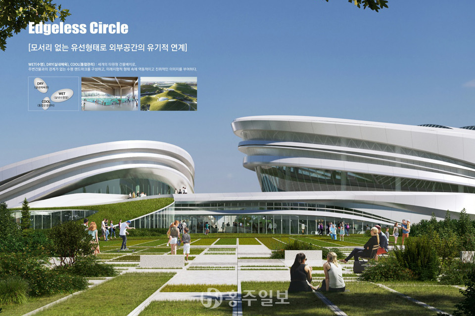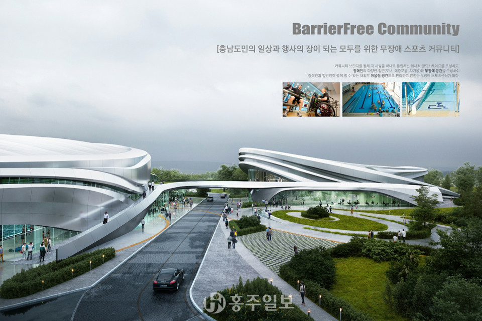 이번 용역은 에이앤유디자인그룹건축사사무소가 지난 4월 공모에 선정된 작품을 바탕으로 용역을 진행, 내년 2월까지 충남체육의 랜드마크를 설계하게 된다. 큐빅ENG 이종철 건축사사무소와 공동 응모해 선정된 에이앤유디자인그룹건축사사무소의 작품은 수영장과 실내체육관, 통합운영센터 등 세 개의 타원형 건축물을 배치했다.