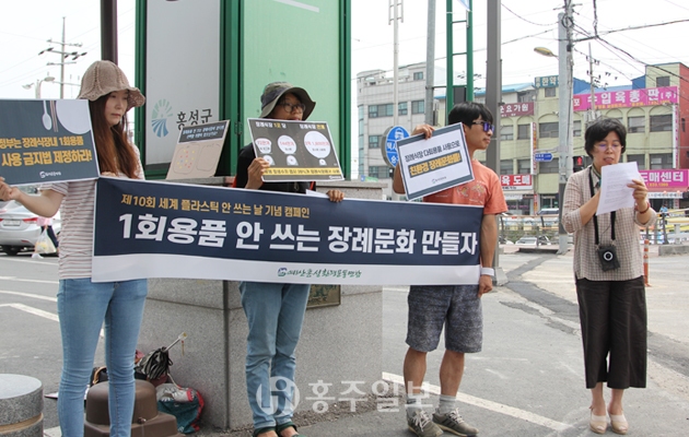 예산홍성환경운동연합(공동의장 김영우·조성미, 이하 운동연합)는 지난 3일 전세계 플라스틱 안 쓰는 날을 맞아 홍성읍 명동거리 일대에서 ‘1회용품 안 쓰는 장례문화 캠페인’을 펼쳤다.