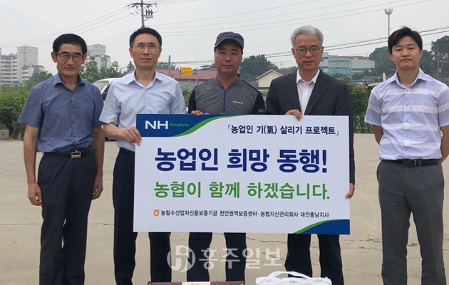 농협자산관리회사 대전충남지사(이사장 이응원)와 농립수산업자 신용보증기금 천안권역보증센터(센터장 김인환) 지난 3일 ‘농업인 氣(기) 살리기 프로젝트’의 일환으로 천안시 서북구에서 배농사를 짓는 한모 씨 농가를 방문했다.<사진>