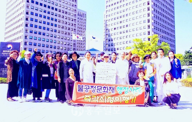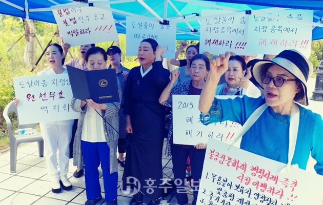정부의 무형문화재 보존 행정이 문화계의 반발을 사고 있다. 지난 10일 도살풀이춤보존회 최윤희 회장(홍성군립무용단 예술총감독)과 도살풀이춤보존회 회원들은 정부대전청사 남문광장에서 자신들의 전통 춤을 선보이며, 문화재청이 지금이라도 잘못된 문화재 지정을 시인하고, 문화재 원형 보존에 나서라고 주장했다.<사진>
