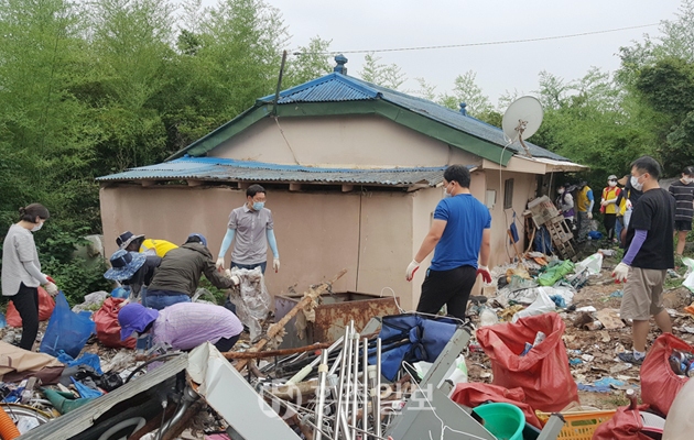 구항면행정복지센터(면장 조성각)와 홍성나눔봉사회(회장 김영만)는 지난 13일 구항면 거주 기초수급자 주택을 방문해 약 5톤 분량의 쓰레기를 수거 및 청소했다.<사진>