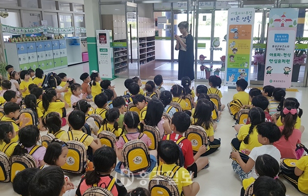 원아들이 지진 대응에 대한 교육을 받고 있는 모습.