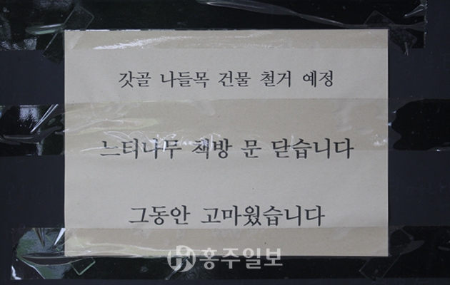 현재 홍동마을 느티나무 책방 앞에는 “갓골 나들목 건물 철거 예정, 느티나무 책방 문닫습니다. 그동안 고마웠습니다”란 안내판이 책방 앞을 지키고 서 있다.