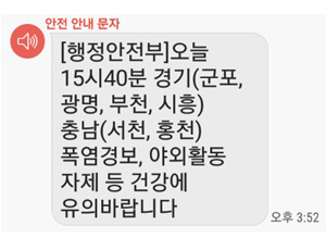 한편, 문자가 발송된 지난 2일 홍성의 최저기온은 24.2도, 최고기온은 32.8도로 불쾌지수는 ‘매우 높음’(자료출처: 기상청 날씨누리)을 기록했다. 다음은 지난 2일 오후 3시 50분 경에 발송된 행정안전부 문자 전문이다. ‘[행정안전부]오늘 15시 40분 경기(군포, 광명, 부천, 시흥) 충남(서천, 홍천) 폭염경보, 야외활동 자제 등 건강에 유의바랍니다’