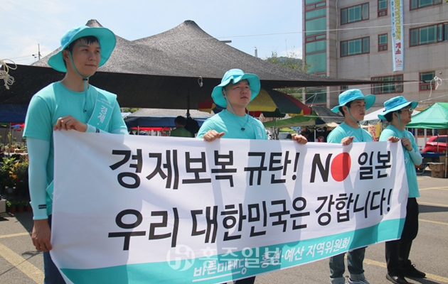 더불어민주당 홍성·예산지역위원회는 당 소속 도의원, 군의원을 포함한 당원 20명과 함께 지난 7일 홍성읍 덕산통 사거리와 불란서 안경원 사거리 등지에서 오가는 주민들을 대상으로 일본의 경제보복 조치 규탄과 일본제품 불매운동 촉구를 시작으로 광복절인 15일까지 홍성읍 도처에서 거리캠페인에 나선다.