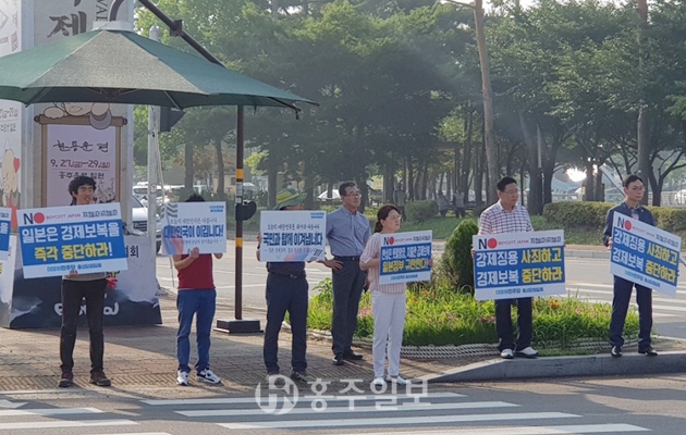 홍성 지역의 정당 당원들도 여·야 가릴 것 없이 거리캠페인을 통해 일본의 경제보복 조치에 대한 규탄 활동을 이어가고 있다.<사진>