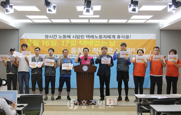 민주노총서비스연맹 강병찬 사무처장은 “택배없는 날이 광복절 다음날인 이유는 택배를 이용하는 고객들의 편의를 최대한 보장하기 위해서 16~17일로 선정한 것으로 알고 있다”며 “택배 노동자들이 과로로 인한 사망과 질병이 우리사회의 정말 심각한 문제가 됐다”고 말했다.