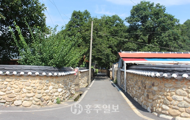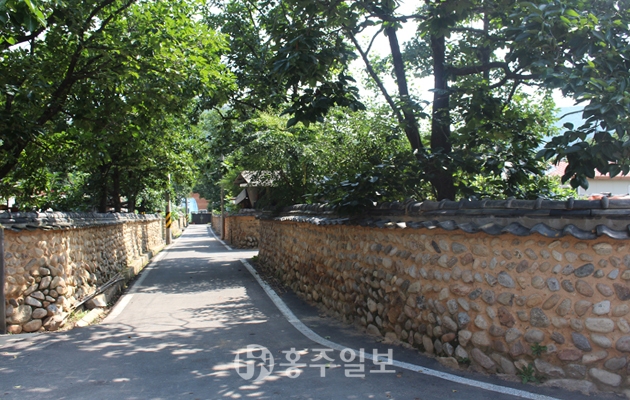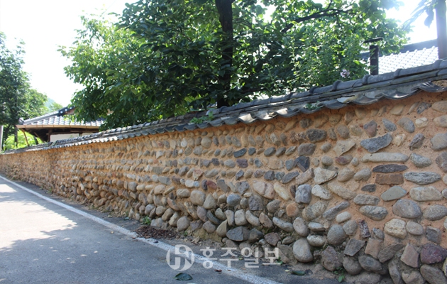 담장의 대부분을 차지하는 토석담은 흙과 자연석을 혼용해 평쌓기를 한 것으로 이어진 담장은 시각적 연속성을 주고 있다. 담의 지붕은 한식기와가 아닌 시멘트 기와로 처리돼 있어 아쉬움으로 남는다. 전체적으로 전통 가옥, 남대천, 노거수와 더불어 마을 전체에 식재돼 있는 감나무는 한 폭의 풍경화를 담아내기에 부족함이 없어 보인다. 또 이들과 함께 어우러진 담장 또한 산골 마을의 전형적이고 아담한 분위기를 연출하고 있다. 담장의 형태는 길이가 700~1000m 정도가 될 것이며, 담장의 높이는 사람의 키를 크게 넘지 않는 특징이 있다. 전형적인 돌담과 토석담이 주를 이루며, 시기는 대략 17세기 후반 경에 형성된 것으로 추정되고 있다.