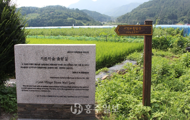 지전마을은 옛 돌담(등록문화재 제262호)의 아름다움을 고스란히 품은 한적한 시골 마을이다. 이 마을의 담장은 대부분 돌담으로 쌓여 있어 산골마을의 전형을 고스란히 보여주고 있다. 담장의 높이 또한 사람의 가슴 높이에 불과해 친근감마저 주고 있다. 조바심을 버리고, 돌담길을 여유 있게 걷다보면 심란했던 마음이 평정될 듯도 싶다. 하지만 마을에는 사람이 살고 있지 않은 빈집들이 많고, 허물어진 담장이 곳곳에 보이는 것은 큰 아쉬움으로 남는다.