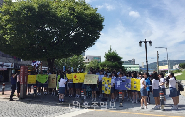 홍성여고 학생들은 일본의 만행을 잊지 않겠다며 일본의 사과를 요구하는 피켓과 일본 제품 불매 운동과 관련된 피켓을 들고 행사를 진행했다. 이어 학생들의 자유발언 시간에는 ‘위안부’ 문제에 관해 일본이 취하고 있는 태도에 대한 생각, 일본의 독도 영유권 주장과 현재 이뤄지고 있는 일본 불매 운동에 대한 생각을 함께 들을 수 있었다.