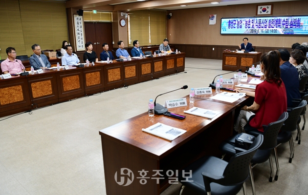 홍성군이 2019년부터 2023년까지 5년간 이어지는 농업·농촌 발전계획을 수립했다.<사진> 지난 16일 홍성군은 군청 회의실에서 심의회 위원 16명과 사업관련 부서장·관계 공무원 등이 참석한 가운데 홍성군 농업·농촌 식품산업 발전계획 수립 심의회를 가졌다. 이번 용역을 맡은 (사)국가산업개발원 유진병 본부장은 홍성군을 4대 권역 3대 축으로 나눠 공간 발전 구상을 제시했다.