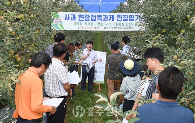 충청남도농업기술원(원장 이광원)은 지난달 21일 예산군 삽교읍에 위치한 사과 농가에서 ‘사과 신기술 농가 현장접목연구 평가회’를 개최했다.<사진>