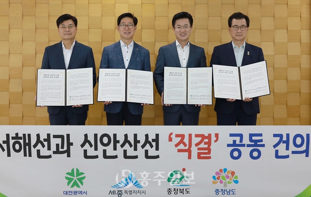 충남도(도지사 양승조)를 비롯한 충청권 4개 시·도가 ‘서해선 직결’을 촉구하고 나섰다. 양승조 충남도지사와 허태정 대전시장, 이춘희 세종시장, 이시종 충북도지사는 지난 24일 대전인터시티호텔에서 ‘서해선과 신안산선 직결 충청권 공동 건의문’을 채택했다.<사진>