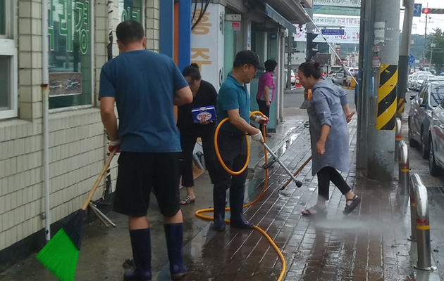 명동상가 상인회가 주도적으로 준비한 이날 대청소는 상인들이 직접 참여해 점포 앞 방치된 쓰레기 줍기와 잡초제거 등은 물론 상인회에서 구입한 고압세척기 2대를 활용해 혹서기 묵은 때를 벗겨내는 물청소도 병행했다.