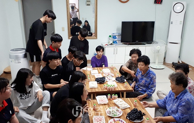 이날 실시된 봉사활동에서는 학생들과 학부모, 교사들이 직접 빚은 송편과 함께 준비한 과일, 음료 등을 전달하고 환경정화 활동과 학생들이 방과 후에 틈틈이 배운 악기들을 연주하는 등 여러 활동을 통해 어르신들께 작은 즐거움을 선사했다.