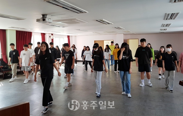 홍성군청소년자원봉사단 청로회(회장 이철이) 학생들이 지난달 31일 홍성읍의용소방대 대강당(구 소방서)에 모여 오는 27일부터 열리는 홍성역사인물축제에서 선보일 ‘독도는 우리 땅’과 ‘독립군가 플래시몹’을 연습했다. 이번 연습은 플래시몹에 한 번도 참여해보지 못했던 1학년 학생들을 중심으로 이뤄졌다.<사진>