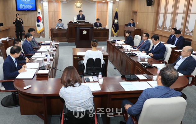 홍성군의회(의장 김헌수)가 지난 18일 의회 본회의장에서 제262회 임시회를 개회했다.<사진> 이번 임시회는 오는 25일까지 8일간의 일정으로 열리며 2019년도 제2회 추가경정 예산안과 조례안 등 일반안건을 처리할 예정이다.