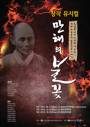 창작 뮤지컬 ‘만해의 불꽃’이 가을날 홍성군에서 막을 올린다.<사진> (사)한국음악협회 충청남도지회(회장 한상복)가 주최하고 충청남도와 홍성군이 후원하는 ‘만해의 불꽃’은 3·1운동 이후 동료의 변절과 목숨의 위협 속에서도, 나라를 구하는데 타협하지 않고 굳은 의지로 앞장선 만해 한용운 선사를 다뤘다. 특히 선사의 독립을 향한 의지를 숨 막히는 이야기로 전개할 것이다.