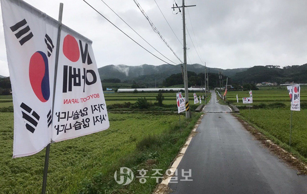 장곡면 상송2구 마을 진입로에 ‘NO아베’ 문구가 적힌 깃발 100여개가 태극기와 나란히 걸려있어 지나다니는 행인들의 눈길을 끌고 있다.<사진>