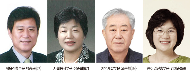이날 심의결과 선정된 수상자들은 △체육진흥부문 백승균(57) △사회봉사부문 장순화(67) △지역개발부문 오동혁(68) △농어업진흥부문 김미순(59) 4명이다.