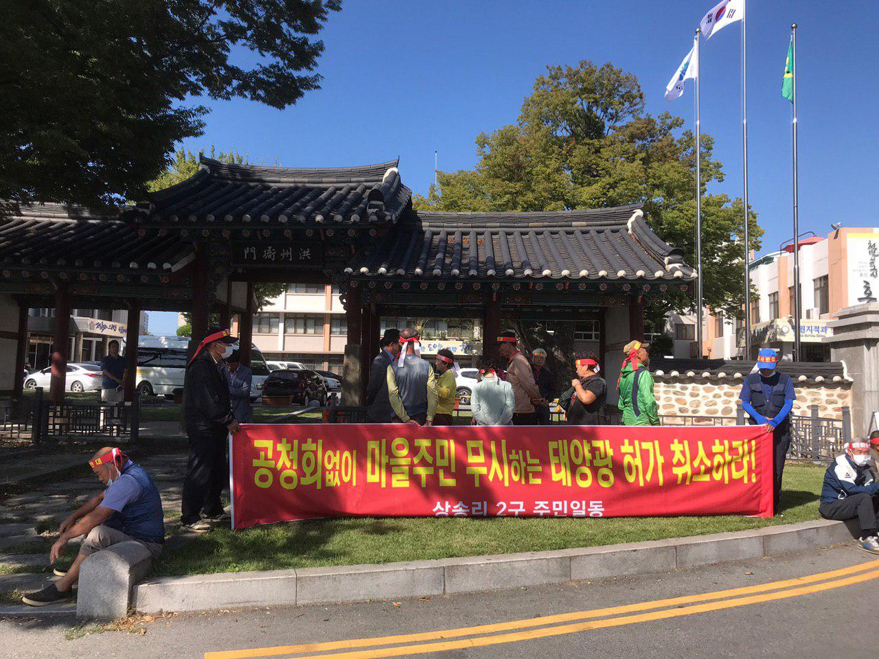 장곡면 상송2구 주민들은 19일 오전 군 직원 출근시간에 군청사 정문에 모여 군이 허가한 태양광 발전 사업을 취소해달라며 김석환 홍성군수와 면담을 요청했다.