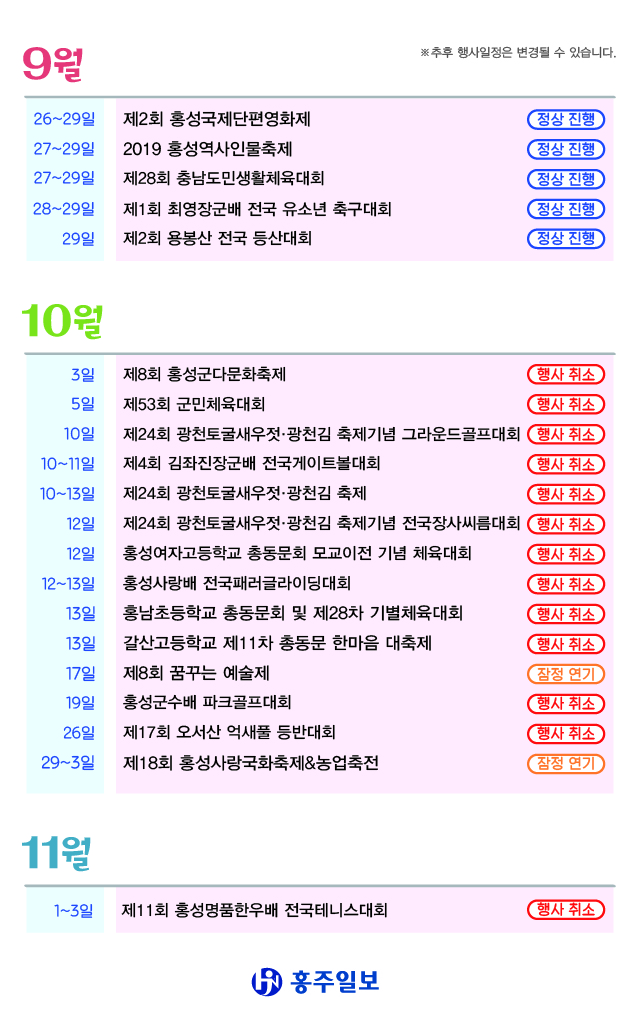 9월 25일 현재 취소됐거나 연기된 홍성군 관련 행사들은 다음과 같다.