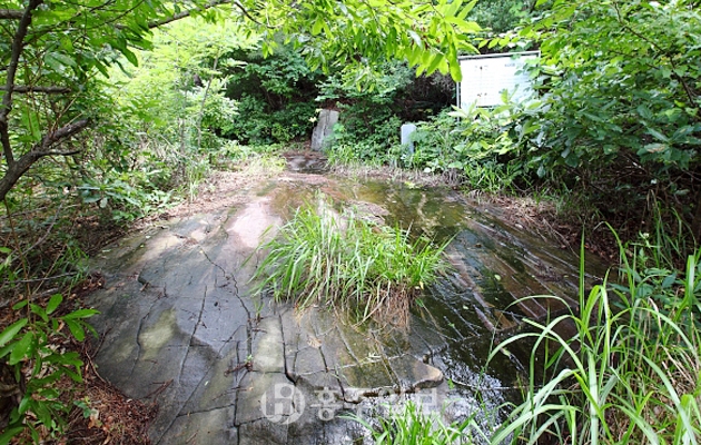 주위에는 고려 때 최영 장군이 왜구들을 물리친 홍산대첩의 무대였던 구룡평야와 태봉산성(충남도지정 문화재자료)도 있다. 천보산의 암질은 자갈 콘크리트를 버무린 것처럼 1억 년이 넘은 타포니(Taffoni) 현상을 이루고 있다. 그러고 보니 어디서 많이 본 듯도 하다. 바로 진안의 마이산을 빼닮았는데, 우리말로 하면 풍화혈(風化穴)이라고 한다. 천덕산에서는 금북기맥을 잇는 비득재 방향으로 내려서지 않고 아홉사리 고개로 내려선다. 이 길은 옛날 민초들이 무수히 오갔던 고갯길로 발길에 길이 움푹 파여져 있기도 하다. 안내판의 ‘상천유원지 문녕기’의 ‘문녕기’라는 말은 이곳 방언으로 저수지 댐을 일컫는 말이다.