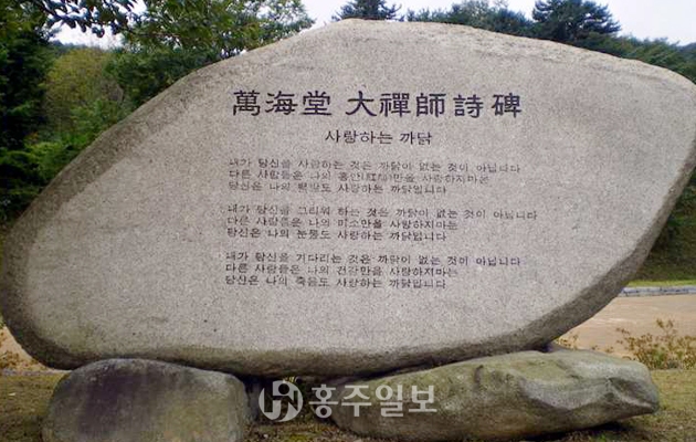 건봉사의 시비 ‘사랑하는 까닭’을 직접 눈으로 확인하며 만해의 ‘님의 침묵’이나 ‘알 수 없어요’라든가 ‘나룻배와 행인’이나 ‘사랑하는 까닭’ 등의 만해의 시가 교과서에 등장한다는 사실을 기억했다. 대부분의 만해 시에는 ‘님’을 중심으로 구성됐다. 그러면 만해의 여러 시에 나오는 ‘님’이 의미하는 것은 과연 무엇인가? 만해를 독립운동가로 본다면, ‘님’은 빼앗긴 조국인가? 만해를 승려이자 불교사상가로 본다면, ‘님’은 불타(佛陀)인가? 혹은 중생(衆生)인가? 또한 만해를 한 사람의 남자로 본다면, ‘님’은 사랑하는 여인인가? 아니면 이 모든 것일 수도 있고, 또 이들 중 어느 것도 아닐 수 있는가? 많은 논자들의 의견대로 ‘님’의 정체와 관련해 민족·조국·민중·불타·중생·불교의 진리 등으로 해석할 수밖에 없는 일이다.