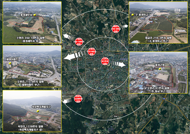 △홍성읍 오관리 61번지 일원(현 청사 부근)은 25개 필지 3만 5249㎡의 대상부지로 편입면적 공시지가는 147억2604만3200원이며 ‘오관지구 이장단 및 상인협의회’가 신청했다.