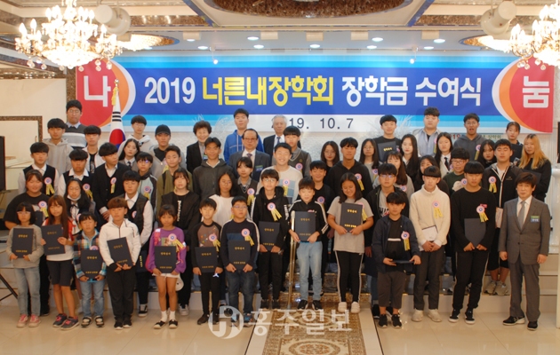 너른내장학회(이사장 편기범)는 지난 7일 광천읍 현대예식장에서 ‘2019년 장학금 수여식’을 갖고 관내 60명의 초·중·고 학생들에게 총 4440만 원의 장학금을 지급했다.