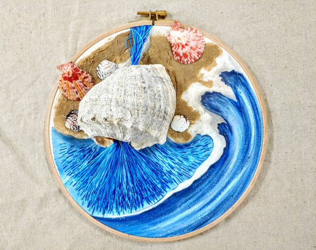 요즘 자수 작품을 하게 되면 콘셉트를 정한 다기보다는 지금 느끼는 나의 감정과 앞에 놓은 일들을 표현한 작품을 많이 했다. 하지만 이번 작품은 개인적인 감정보다는 눈앞에 있는 바다와 소리를 표현하고 싶었다. 그래서 수틀과 바늘을 꺼내 바다는 그림으로 파도는 실로 모래는 진짜 모래로, 소라에 실을 통과하여 내가 느낀 소리를 표현하여 바다의 한 부분을 표현하여 만들었다.