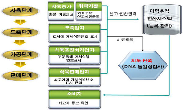 한편, 소비자는 휴대전화(6626 + 무선 인터넷 키)나 이력추적시스템 등에 쇠고기에 표시된 개체식별번호 12자리를 입력하면 소의 사육자․종류․원산지․출생일․등급 등을 확인할 수 있다. 아울러 소가 도축돼 가공․판매되는 과정에서 둔갑 등 부정유통 되는 것을 방지하기 위해 DNA동일성검사와 함께 시․도 및 농산물품질관리원의 지도단속도 실시하게 된다. DNA동일성검사를 위해 도축장에서 전 두수에 대한 시료를 채취해 축산물등급판정소에 보관한 후에 식육포장처리장과 식육판매장 등 지도단속 과정에서 샘플로 시료를 채취해 동일성여부를 판별하게 된다. 또한 국내 축산물 유통 여건상 사업규모가 적거나 1인 사업체 등 영세업체가 다수인 점을 고려해 올해 8월 31일까지 계도 위주로 지도한 후 본격적으로 단속해 나갈 방침이다.