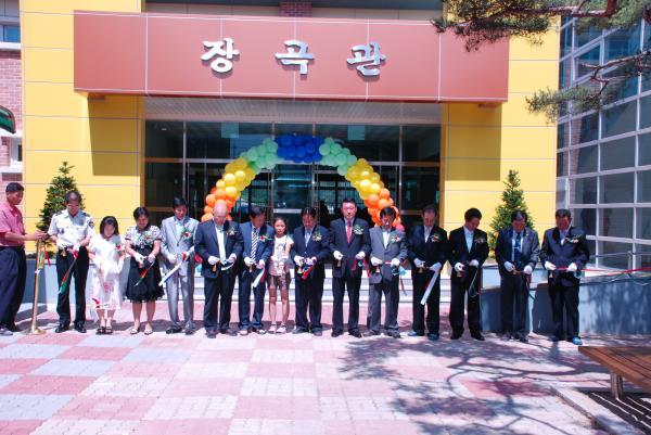 지난해 9월에 착공 지난 4월에 완공이 됐지만 농번기가 겹쳐 지역주민들의 참가가 어려워짐에 따라 이제야 개관식을 갖게 됐다. 개관테이프 커팅을 시작으로 시작된 개관식에서는 김동국 교장의 내빈소개 및 경과보고에 이어 감사패가 전달됐다. 김광태 홍성교육장과 채광호 충청남도교육위원의 치사와 축사가 이어졌다. 이번 사로 다과회와 장곡면사무소, 농협, 소방대, 학교 4개팀으로 나눠 배구시합을 벌였다.
