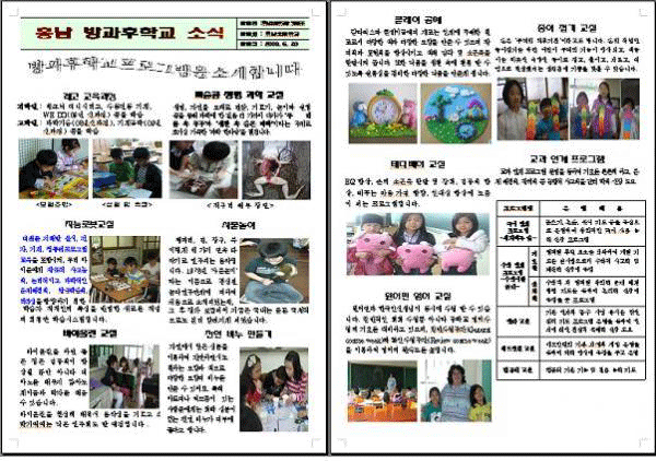 제1호 소식지는 방과후학교 소식, 운영의 목적과 필요성, 방과후학교 알림판 등의 내용과 운영 중인 프로그램을 대상, 장소, 운영 시간 등을 소개하여 학생들이 프로그램이 겹치지 않도록 효율적으로 시간을 활용하여 다양한 방과후학교 프로그램에 참여할 수 있도록 하는 내용을 담고 있으며, 이번에 발간된 제2호 소식지는 운영되고 있는 프로그램을 소개하는 내용과 작품이나 학생들의 활동사진을 담고 있다.