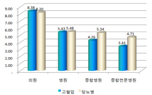 고혈압 환자의 일인당 내원일수는 2008년에 평균 7.38일이었는데, 종별로는 의원이 8.38일로 가장 높았고, 당뇨병 환자의 일인당 내원일수는 평균 7.09일이었는데, 의원이 8.20일로 가장 높게 나타났다.