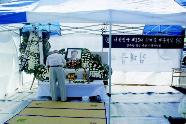 故 김대중 전 대통령이 지난 18일 오후 서거함에 따라 민주당홍성당원협의회가 홍성읍 복개주차장에 분향소를 마련해 주민들의 조문을 받기 시작했다.