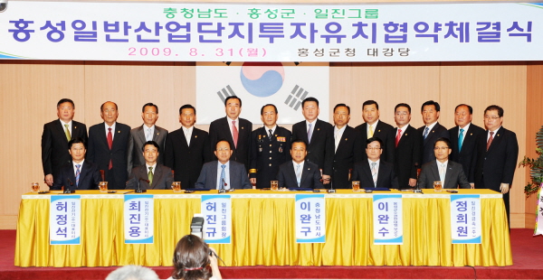 이날 이완구 충남도지사, 허진규 일진그룹 회장, 최진용ㆍ허정석 일진전기(주) 공동대표, 이완수 홍성군수 권한대행은 일진전기 등 그룹 계열사의 갈산면 홍성일반산업단지 투자 및 이에 따른 충남도와 홍성군의 행ㆍ재정적 지원에 관하여 협의하고 적극적 협력관계를 유지하기 위한 양해각서에 서명하고 이를 교환했다.