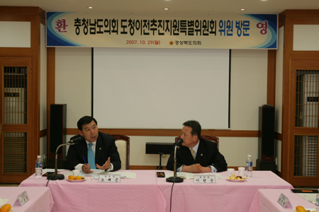 충남도의회 도청이전특위(위원장 , 오배근)는 제209회 임시회 폐회 중 비회기 임에도 불구하고 지난 10. 29일과 10. 30일 2일간 경상남·북도 의회를 방문, 도청이전특별법 통과에 상호 협조하기로 하는 등의 성과를 올리고 돌아왔다. 오배근 도청이전특위 위원장을 비롯한 의원들은 도청이전을 함에 있어 천문학적으로 소요되는 비용과 이전에 따른 과도한 시간과 절차를 극복하기 위해 충남도에서 마련한 도청이전특별법이 연내에 통과되어야 한다는데 의견을 같이하고 상호협력을 아끼지 않기로 했다.