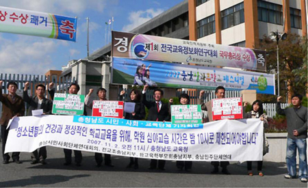 이에 대해 충남의 교육·시민·사회단체들은 “청소년들은 기본적 인권이 보장되는 교육환경에서 건강하고 행복하게 젊은 시절을 보낼 권리가 있다”며 “우리나라 청소년의 절대다수가 학원을 이용하고 있는 상황에서 교육청이 제시한 새벽 5시부터 자정까지의 학원교습시간 제한은 청소년에 대한 기본권을 말살하는 행위”라고 주장했다.