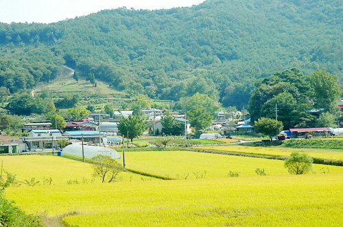 산으로 뒤덮힌 분지형 농촌마을