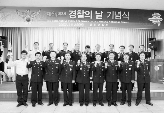 제64주년 경찰의날 기념식이 지난 21일 홍성경찰서 대강당에서 열렸다. 김택준 서장은 직원들에게 "주민들에게 공감받는 경찰, 주민을 위한 경찰"이 될 것을 강조했다. 유공경찰관 표창은 교통관리계장 이광선 경위가 국무총리상, 광천지구대장 최종구 경감이 장관상을 받는 등 총 42명이 수상했다. 저작권자 © 홍주일보 무단전재 및 재배포 금지 윤종혁 기자 다른기사 보기 페이스북 카카오톡 URL복사 기사공유하기