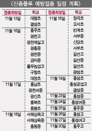 군내 확진환자 중 급격한 확산추세를 보이고 있는 학생환자들로 인해 각급 학교에서는 등교중지와 임시휴업 등으로 확산에 대비하고 있다. 학교별 상황으로 보면 홍성고등학교가 지난 10일부터 4일간 1학년에 한해 임시휴업을 실시한데 이어 홍주중학교에서는 2학년을 대상으로 4일간 임시휴업 했다. 이에따라 홍성군보건소는 신종플루 백신 접종을 홍성지역 초․중․고교생들을 대상으로 본격 시행했다.