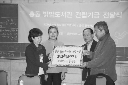 홍동 밝맑도서관 건립을 위해 아이쿱(ICOOP)생협에서 3138만1500원의 기금을 도서관추진위원회에 전달했다.