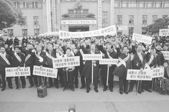 이들은 또 "세종시는 당리당략이 아닌 국가 백년대계의 중차대한 국책사업 원안대로, 법대로 추진돼야 한다"며 "세종시 수정법 개정을 즉각 중단하고,(이 대통령이) 2007년 대선에서 약속한 행정중심복합도시, 명품도시 건설 약속을 이행하라"고 촉구했다.
